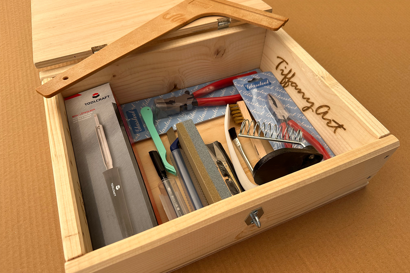 Un set complet de unelte, de buna calitate, recomandate pentru startarea unui Hobby in tehnica Tiffany, toate cele prezentate fiind scule profesionale, toate asezate intr-o Cutie de Lemn